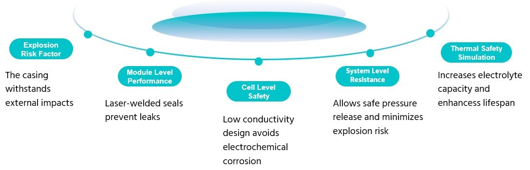 Basado en el modelo de fuga térmica desarrollado por los investigadores de Pylontech, la compañía domina la clave para mejorar la seguridad de las celdas de batería optimizando los materiales de los electrodos, membranas y electrolitos para reducir la tasa de reacción de fuga térmica, disminuir la producción de calor y reducir el contenido de gases combustibles. Además, Pylontech adopta una estructura de celda que puede aislar eficazmente los electrodos positivo y negativo, evitando cortocircuitos internos, utilizando materiales como cerámica, papel de membrana recubierto con adhesivo, etc., para mejorar la estabilidad mecánica y el margen de seguridad de la celda.